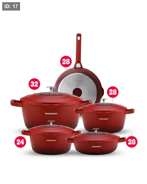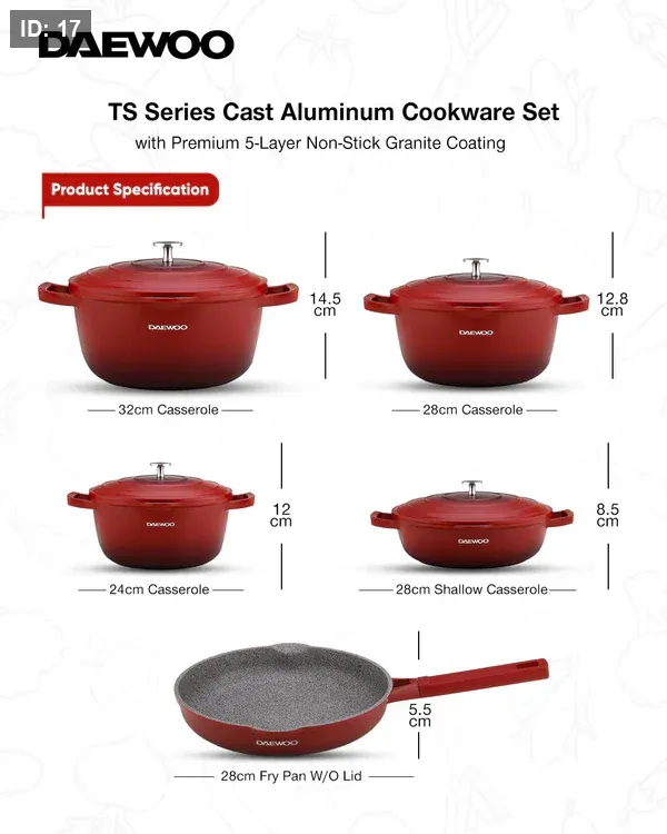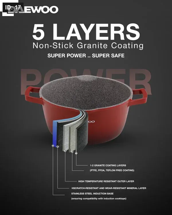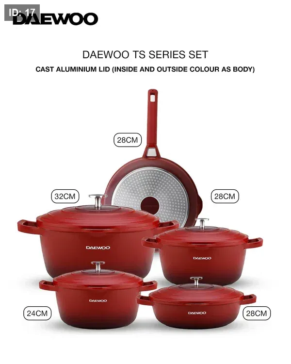 هيكلها المصنوع من الألومنيوم المصبوب المقوى، صُممت مجموعة أواني الطهي هذه لتدوم طويلًا. سواء كنت تُحضّر وجبات يومية أو أطباقًا فاخرة، فإن سلسلة دايو TS مصممة لتلبية جميع احتياجاتك في المطبخ بمتانة لا مثيل لها.