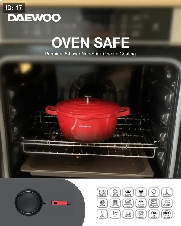 طقم طهي دايو TS Series الجرانيتيّ، المكون من 9 قطع، ليس مجرد مجموعة أواني طبخ عادية، بل هو استثمارٌ حقيقي في رحلة طبخك. مصنوع من مواد عالية الجودة، يجمع بين المتانة والأناقة، ليُحسّن من تجربة مطبخك. اطبخ بدقة وثقة وسهولة، مع العلم أن كل قطعة من هذا الطقم مصنوعة لتدوم طويلًا.