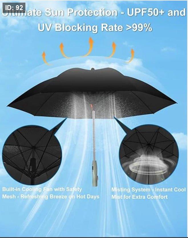 مظلة متعددة الوظائف: مظلة جديدة متعددة الوظائف، تحتوي على وظائف لا تمتلكها المظلات العادية، مع بخاخ ومروحة، لذا ستشعر أيضًا بالبرودة في الطقس الحار.